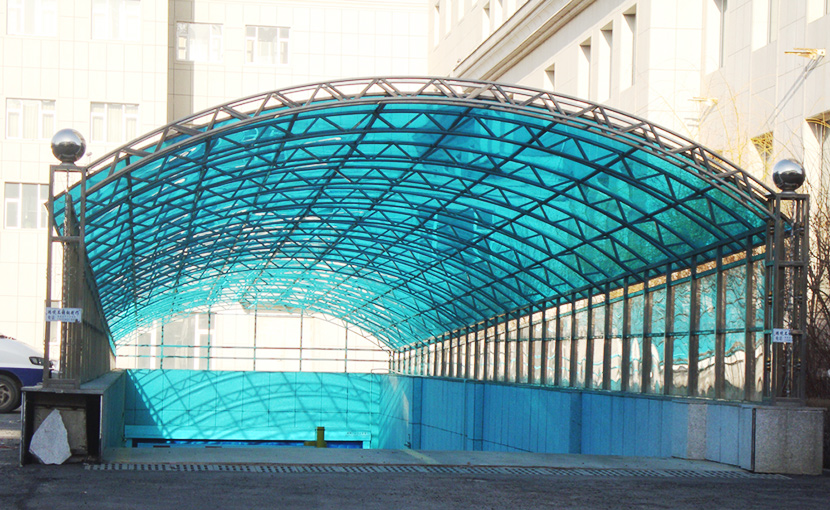 上海耐力板地下車(chē)庫入口使用的是我廠(chǎng)3.5mm厚的藍綠色耐力板,單個(gè)車(chē)棚150平米。